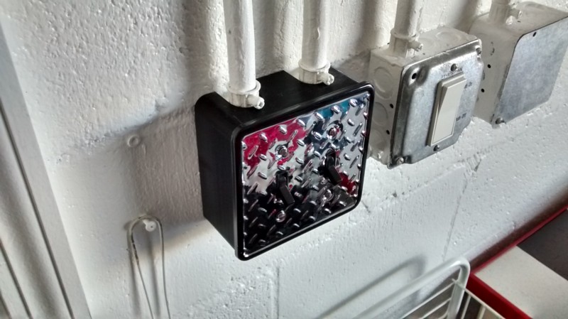 We saw these great diamond plate switch plates on clearance. They're really nice in that they have a black edge with a radius. Also, they are larger than our junction boxes, so it left a lot of room around the outside. So, naturally I thought of creating a black surround that would fit into the edge trim of the plates and create an alternate exterior. The white area on the rightmost finished box is actually a nightlight we found that fits in a Decora opening. |