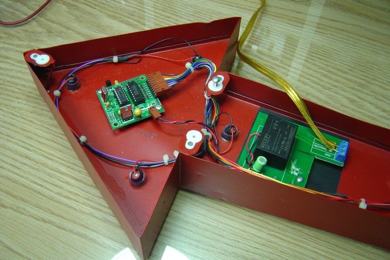 We bought this decorative metal arrow sign at a really great price because it was all open in the back with the wiring all mangled and didn't have a power supply. It normally just lit up all the bulbs, but I designed a small PCB with a microcontroller to sequence the lights. It was originally designed to hang on the wall, and had lots of keyslots to allow mounting. I designed a kind of keyslot-to-mounting-hole adapter that let us use sheet metal screws to attach a backplate we made from plexiglass that Linda painted red. Sometimes the little things give you the most satisfaction. |