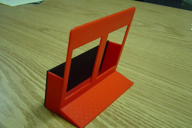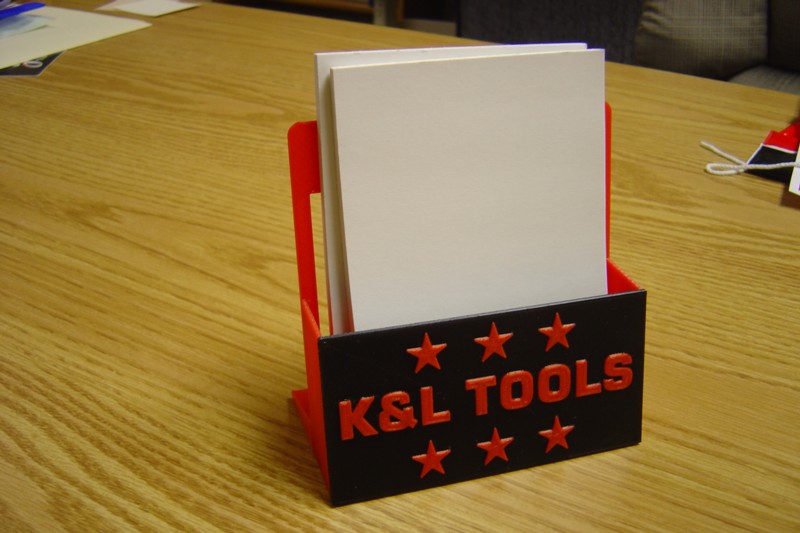 This is a notepad holder for the shop. Originally it was going to have a magnet on the back and hang on the left side workbench support. But while I was designing it, I thought this would be a good time to try dual color/extruder printing, which was one of the features of the Wanhao I knew I would want to use.