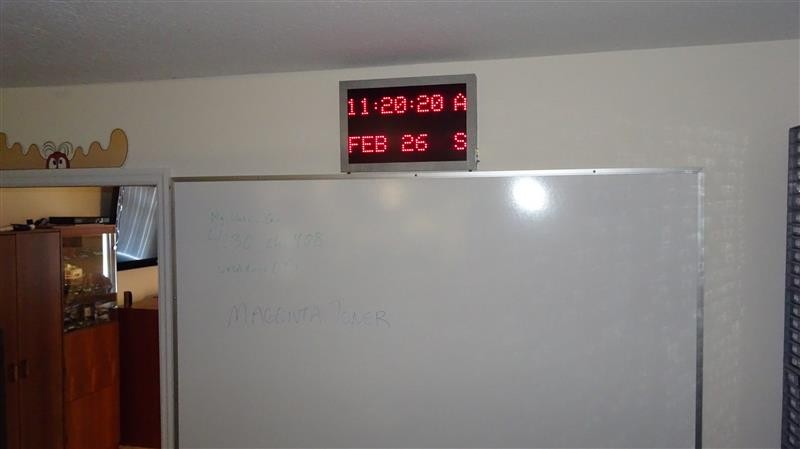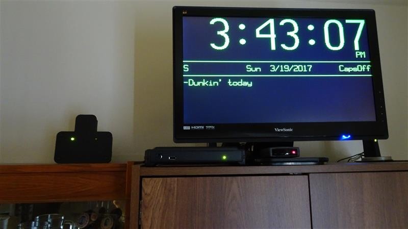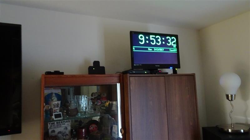 It’s hard to find a nice big clock. So, I took a product I had designed for one of my many failed entrepreneurial attempts and made the Big Clock. The “front desk” element of my “eCheckIn” system outputs a simple VGA signal to drive a modern PC monitor. Since I had an LED backlit 23” monitor sitting around, I thought I would make a clock with huge green digits. It would sit on top of the cabinets in our living room so we could see it throughout the living and dining room areas. So this was entirely a software project, having designed and built the unit several years ago.