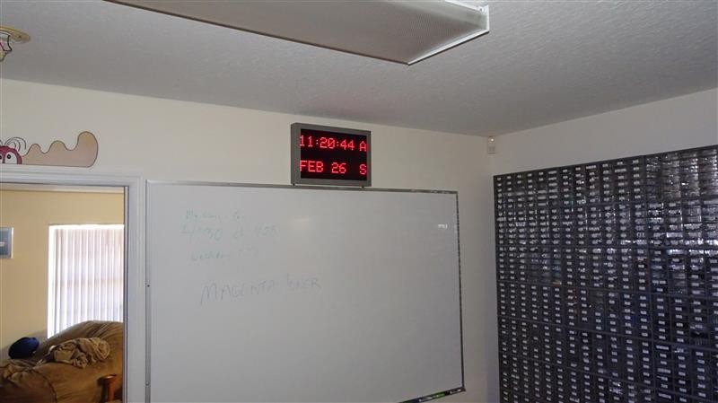 While I was at it, since I had that big screen, I decided to also show the day and date. In the lower part of the screen, I have a 6 line by 40 character text area. Here, using a wireless keyboard, you can scroll through to any day of the year and enter/edit reminders for that day in non-volatile memory. Things like a reminder to get ready for a car show, or just some program to watch on that day. When that day arrives, the text you entered will be displayed.