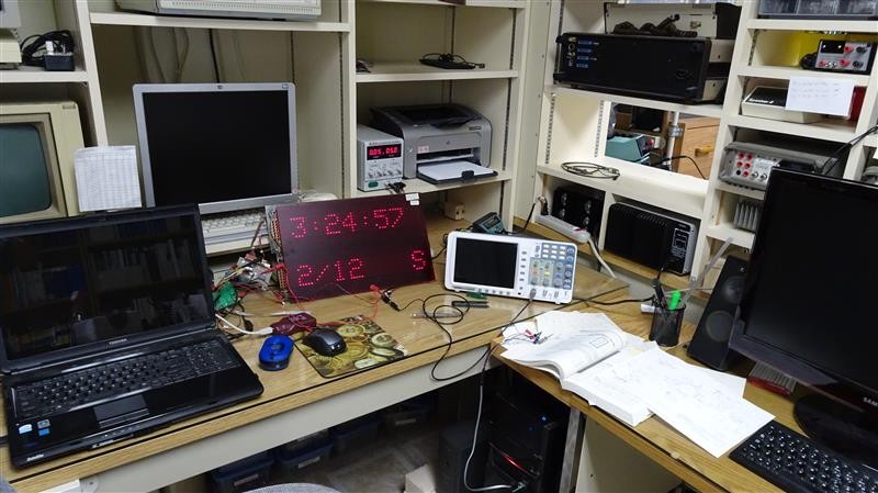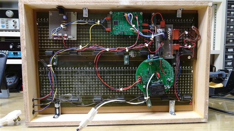 Years ago I had hand-wired a bd. which has source-drivers for the LED matrix rows. Recently, I had hand-wired a WiFi interface bd. (which I later did a PCB layout for to use in the WiFi For Big Clock project). I also repurposed a power supply bd. from my street light controller design job for the AC to 12V supply (round PCB in photo). Onto that I tacked a tiny 5V switching regulator demonstrator bd. from National that I’ve had around for years. The last element was one of my “Dispenser” bds. from my cat food dispenser. It has the µC, RTC, backup battery, 3.3V regulator and plenty of I/Os to bring it all together.