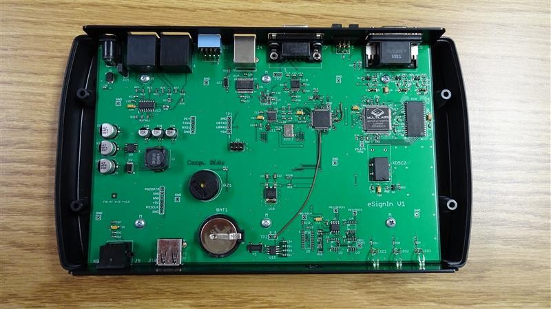 To the left is a photo of the electronics. You can see the backup battery for the Real Time Clock (RTC). It keeps time even when power goes away. The rear panel has a VGA connector which you can see in the upper right corner of the PCB.