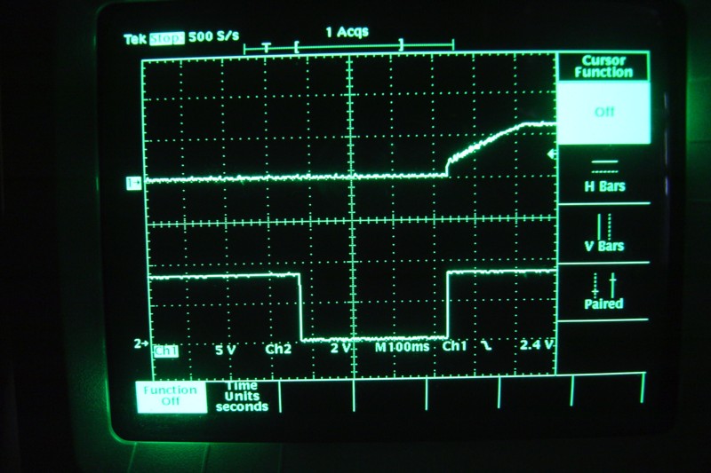 Motor (top trace) and µswitch (bottom trace) during a vend operation. |