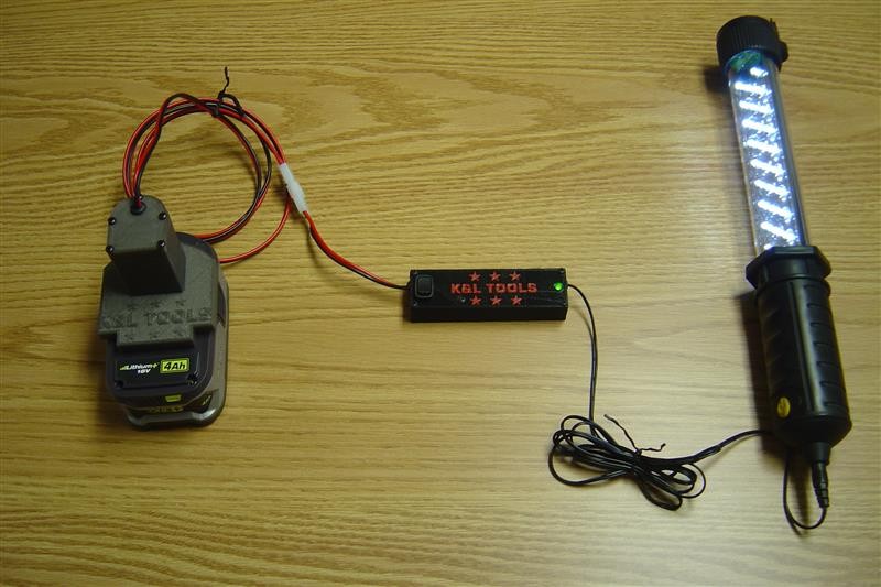So now I have the whole chain. The Ryobi power tap which snaps on the battery, the switching supply to give me the voltage I need with decent efficiency and the output cable is the original charger cable which plugs into the bottom of the worklight.