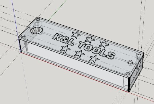 The middle section (seen just after printing to the right) has a plate at the bottom which matches the outline of the bottom section to which it will be super-glued. I also couldn’t resist putting the now ubiquitous “K&L TOOLS” on the face. The D-shaped “silo” has a radius which is an extension of the radius I measured on the battery. At the very top, I had to leave a void where a modified 1/2AA battery holder will get inserted. You can see the black rectangle with wires attached in the 2nd photo. This is the bottom of the battery holder, with it’s spring contacts facing down to meet the top of the Ryobi battery.