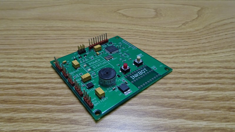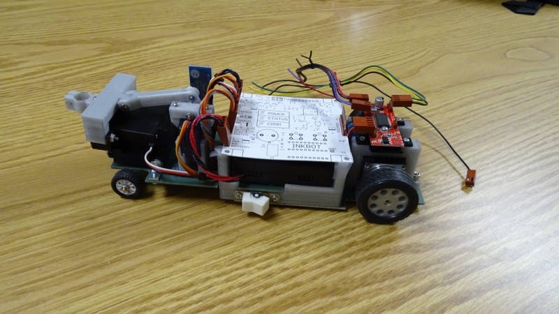That takes care of the front section. The central area is one 3D structure (see photo of raw print) that ties together the following (from the bottom up): the front platform, a small alcove which sandwiches in the power switch, then the most forward area of the rear platform. On top of that is a large void where the battery pack (black box with red & black wires coming out of it) resides. Above that goes InkBot’s custom PCB, which is mounted to the top of the 4 pillars of the central structure with sheet metal screws.