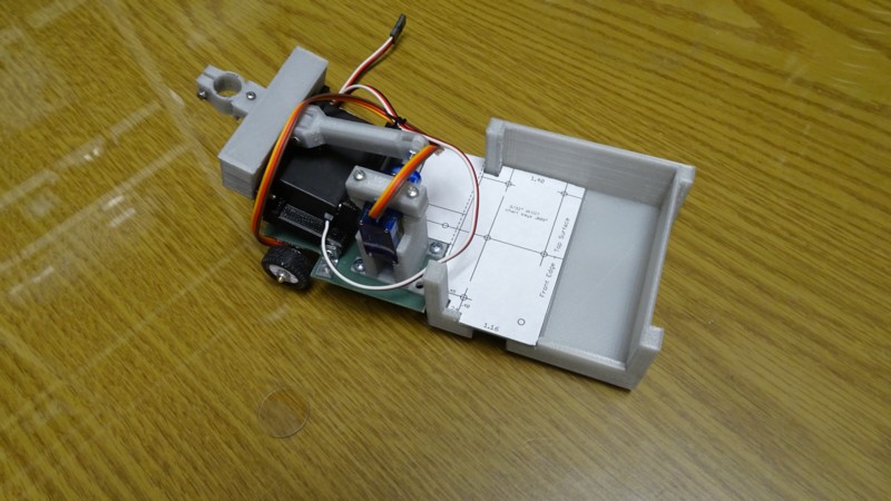 The Z-servo’s output “horn” (lever which comes with servos that transmits the motion energy) is attached to a 3D printed “arm”. This arm has a clevis at each end. When the servo’s output shaft turns, the horn goes through an arc. This pushes or pulls the arm which in turn raises or lowers the Y-servo and it’s custom “carriage” located at the very rear of InkBot.