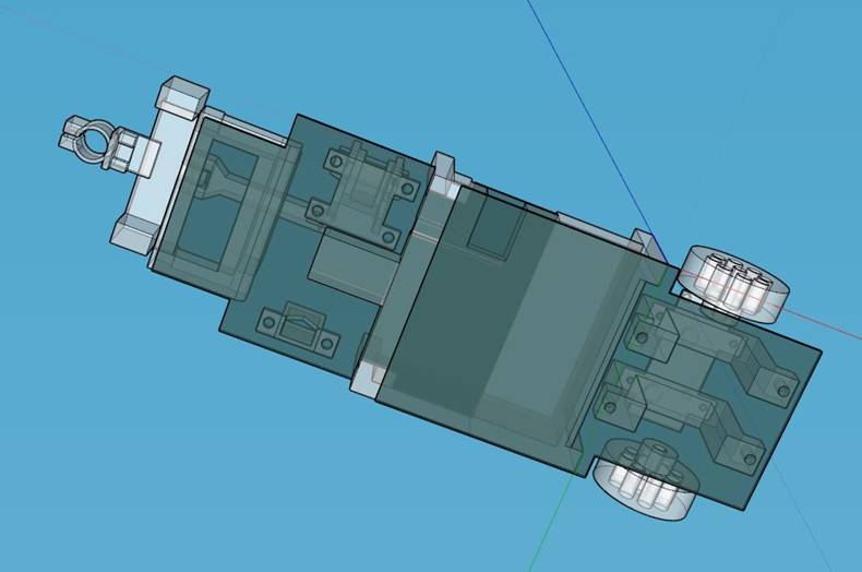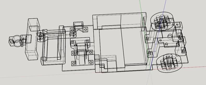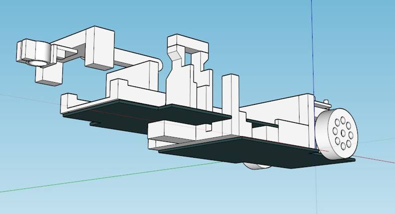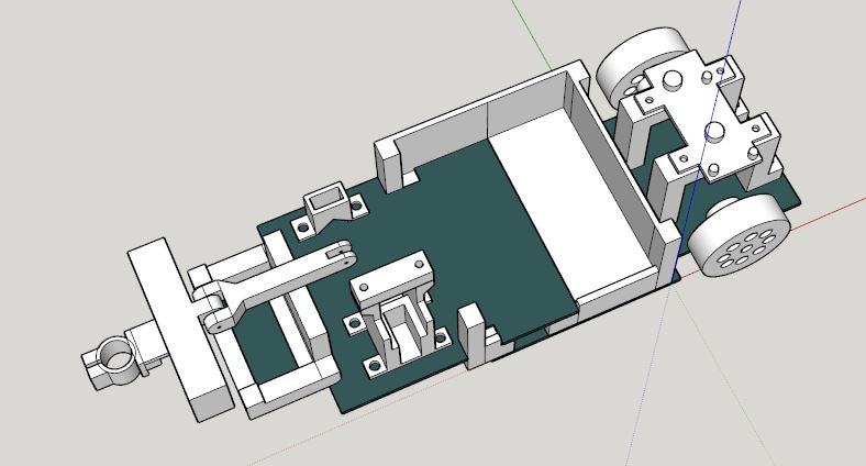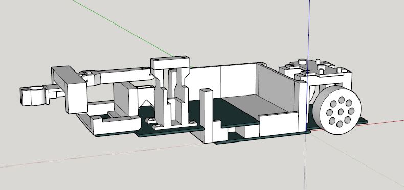 All other elements in the drawings are 3D parts I designed and printed. There are a total of 13 printed parts counting both wheels & both stepper brackets (i.e. 11 designs). Some seem to be located in space because the other parts (Y-servo, Z-servo, stepper motor, tires, PCB, battery holder, stepper driver PCB assy, Bluetooth module, switch, hardware) are not present.