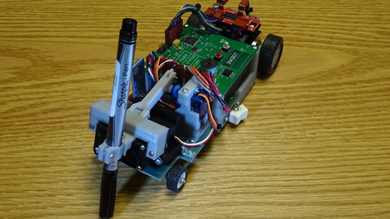 I watched the videos of robotic arms that write the time at the top of a dry-erase board on youtube. Very creative! I knew my next project would have to be a robot that could write. Since I’m really into cars, what better approach than a car-like robot that writes on paper as it travels? This project is about 50% 3D-Printing/Mechanical and about 50% Electronics/Software, but I decided to put it here with my other 3D projects.