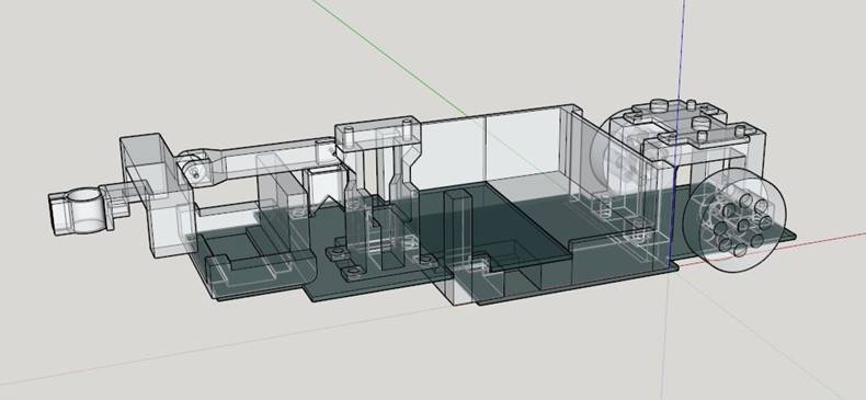 This is a good time to describe InkBot’s overall structure. The whole unit is about 9” long and 3” wide. I used 2 small sheets of .062” fiberglass, essentially PCB material with no copper. These are cut in patterns to create a front & rear “frame”, essentially platforms to build on. In the composite CAD drawings shown here, these platforms are in dark green.