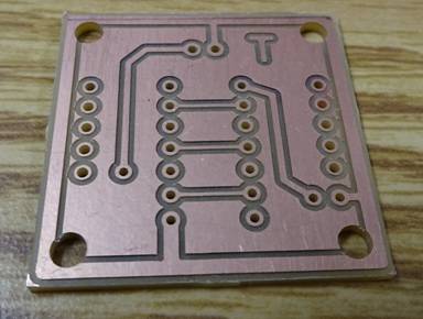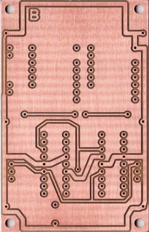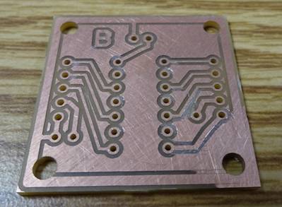 Next was the heart of the project, the LED driver / display bd. I reasoned that trying to make the entire 6-digit clock on one CNC’d PCB was crazy, especially since I was just learning. So, I broke it into 3 identical bds. For my first attempt, I kept it single sided with pads for planned wire jumpers. I used the larger 1206 surface mount resistors because I could use them to jump over traces, minimizing the effect of not having a bottom layer. Then, I got brave and made it double sided. The larger the bd the harder it is to have it perfectly level, so this proved challenging. This bd needed a little xacto-knife fix-up to make it functional. But, having learned a few things from the first two, the third bd worked out perfectly (Photos 8 & 9), ready to go! The CNC mills the track isolation, mills all the holes regardless of size and then mills the entire bd outline leaving just a small tab to hold the material in place which you just snip afterwards. I was quite happy to see this, as the learning curve took about 3 weeks working at it on and off.
