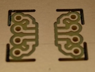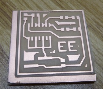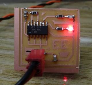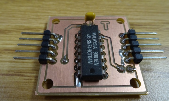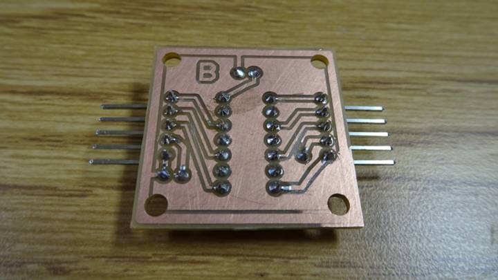 The first thing I tried was single-sided with no holes (Photos 1 & 2). It is just an inverter set up as a slow oscillator, alternating a red & blue surface mount LED. The toolchain I used for this was a ULP plug-in for Eagle but I wasn’t entirely happy with this. I began studying FlatCAM which takes gerber files and lets you define parameters along the way to create .nc files for the CNC. This had kind of a steep learning curve, but now I’m very happy with it. Next I designed an SOIC8 to DIP adapter (Photo 3) which is my first board to have holes.