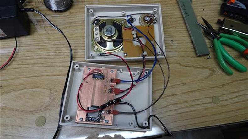 Well, we’re just strange enough to have that too! I used a cheap wireless doorbell from Harbor Freight, found the pulse on the receiver’s PCB which triggers the bell sound (which I disabled), then just used the modified receiver with a short cable to an enclosure where I put an mp3 module, speaker, volume control and a little logic. I designed a PCB to tie it all together and milled it on the CNC. I put the xmtr bd in a small sealed enclosure with a battery holder I salvaged from a HF flashlight. It was first installed in FL, but I have it working now in TN. When the mailman opens the door, we know instantly! It’s a little startling at first, but you get used to it. (click icon to see video of it on the shelf working) |
