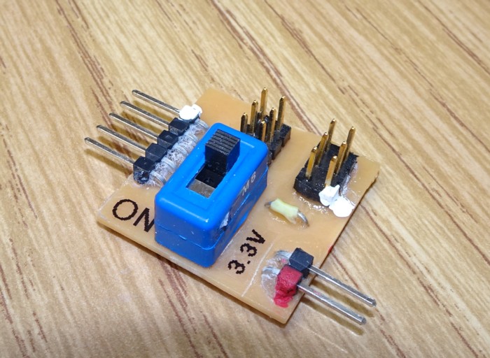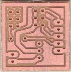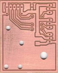 This meant I had to make an adapter that mates with the µC programmer pod’s 6-way female connector and breaks it out to a simple header that I could make a cable to take the signals to the WristClock Bd. Since this was a simple PCB, I decided to make it on the CNC. I used thru-hole parts and laid out a single sided PCB with the traces on the back. |