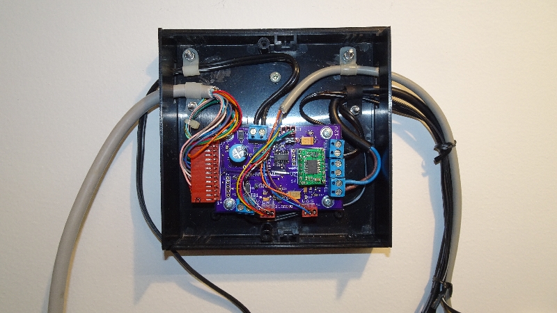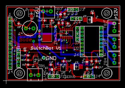 Interface (PCB layout above & finished unit below) designed for SwitchBot. The multi-conductor cable on the left goes up to the user interface. The one on the right goes up to the moving Servo/Hall-Sensor/µswitch assy. |