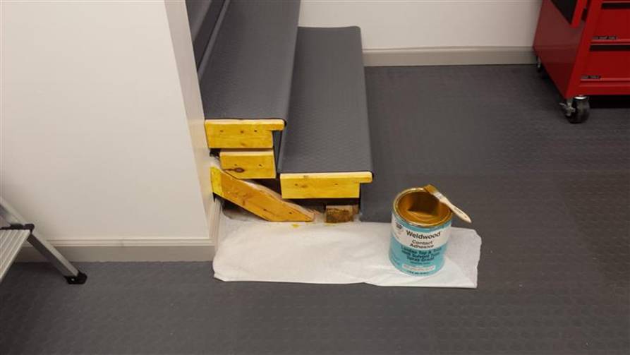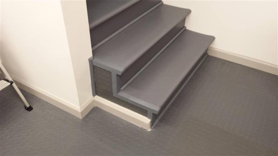 At the bottom of the stairs the structure was showing with uneven protrusions. I built it out with 2x4s and cut some coin mat and glued it to the newly created side. I designed some trim pieces to go over the edges and bullnose and 3D printed them. Linda then painted the whole thing. The bottom photos show before and after. |