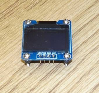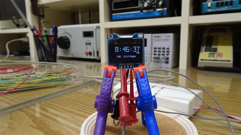 Well, actually a while back I had ordered on a whim a couple OLED displays. They have a .96” diagonal display area with 128x64 pixels. There’s a matrix of anode and cathode junctions which put a small current through electroluminescent material which emits light at that point. Therefore, unlike an LCD which blocks light and needs a backlight to be seen under low light conditions, the OLED actually emits light. These units have an “I2C” interface which allows control with just two µC I/Os. The same I2C bus also talks to the RTC (Real Time Clock) chip. It seemed perfect for a watch project.