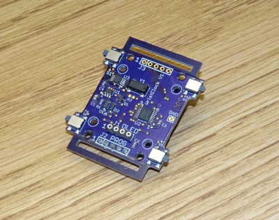 In trying to keep things small, I used a member of my 9S08 µC family that comes in the smallest package I’ve ever worked with. It has 25mil (.025”) lead spacing and was indeed quite a challenge to solder, even under the microscope. I used the smallest packages I could for all the parts and used every facility of the µC such as internal pullup resistors and internal clock generator to minimize the number of passive components. I used a 6KHz piezo for a “beeper” because it was much smaller than the 4KHz I would normally use.