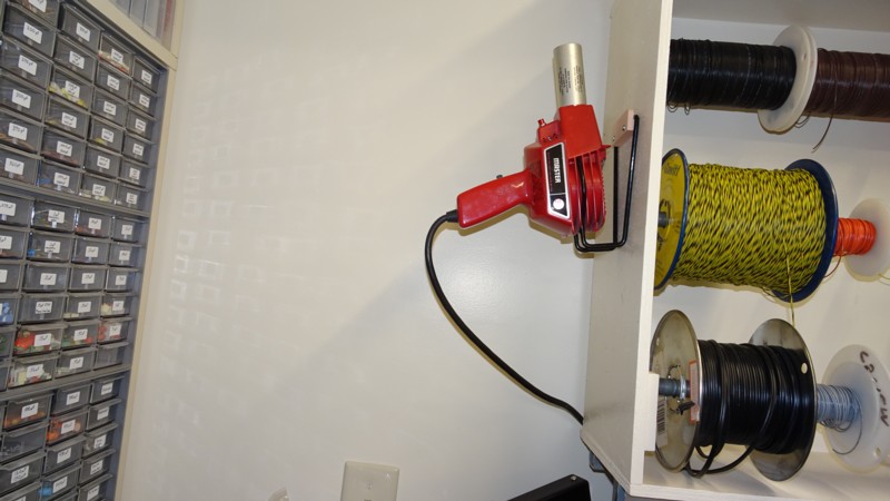 The corner of my hardware bench where I keep my various soldering irons has always been crowded. Recently I thought how nice it would be to get the heat gun out of the way and hang it on the side of the wire rack. You’d think I could just use some hooks or something that already exists, but I ended up spending more time going through my storage boxes looking for the right shape than it took to make the perfect thing.