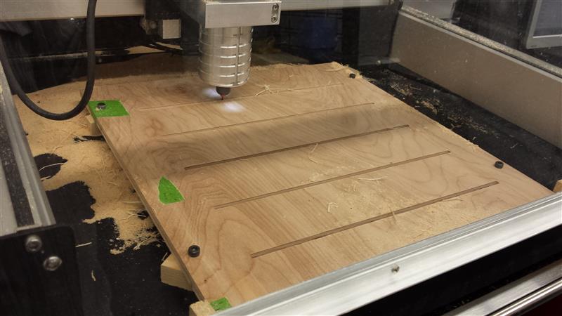 I CNC’d 3 acrylic dividers, then CNC’d 5 channels into a wood base panel, all the way through. This way, she could arrange the dividers any way that worked. The tight channels keep the dividers upright. |