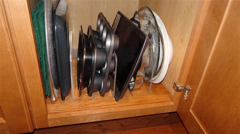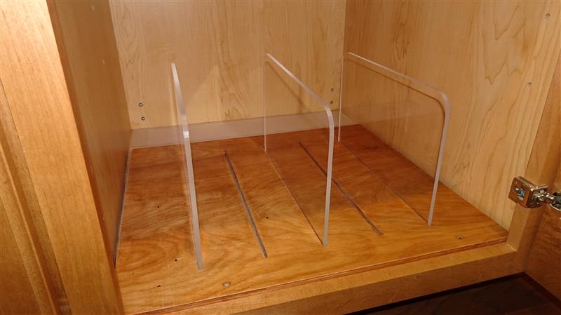 Linda wanted something that would divide pans and plates that were oriented vertically in a lower kitchen cabinet. I went through several ideas, but in the end wanted to go with something that wouldn’t look out of place and kind of disappeared.