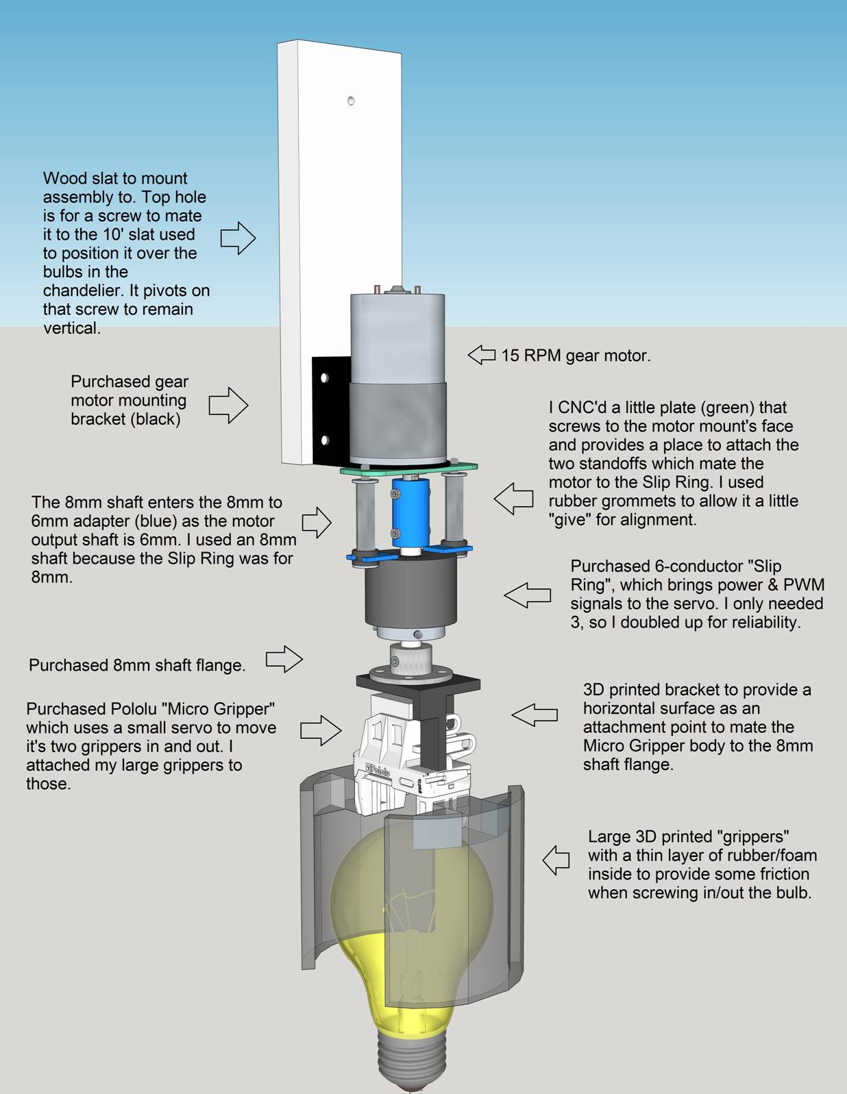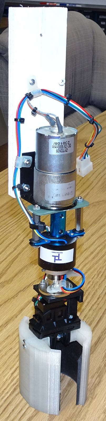 The Micro Gripper attachment points were really meant for some kind of clevis, so I had to design/print a custom bracket which would use these holes to create a horizontal surface on top of the servo. That’s where I needed to put an 8mm shaft flange who’s axis would be in line with the center of the bulb rotation. From there, an 8mm shaft is attached which goes through the Slip Ring and up into an 8mm to 6mm shaft adapter. I chose an 8mm shaft because the only reasonably priced “through” slip ring I could find was made for an 8mm shaft. It has set screws to secure the rotating end to the shaft.