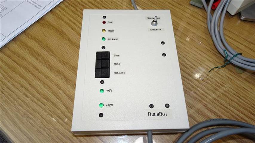 If your bulbs face down, there are many bulb changers available which are just long poles with some type of bands which grip the bulb. You just shove it around the bulb and twist. But when the bulbs face up, it’s a whole other problem. The only choice is to construct a grip-and-rotate machine using a linear servo, slip ring and lo RPM gear motor.
