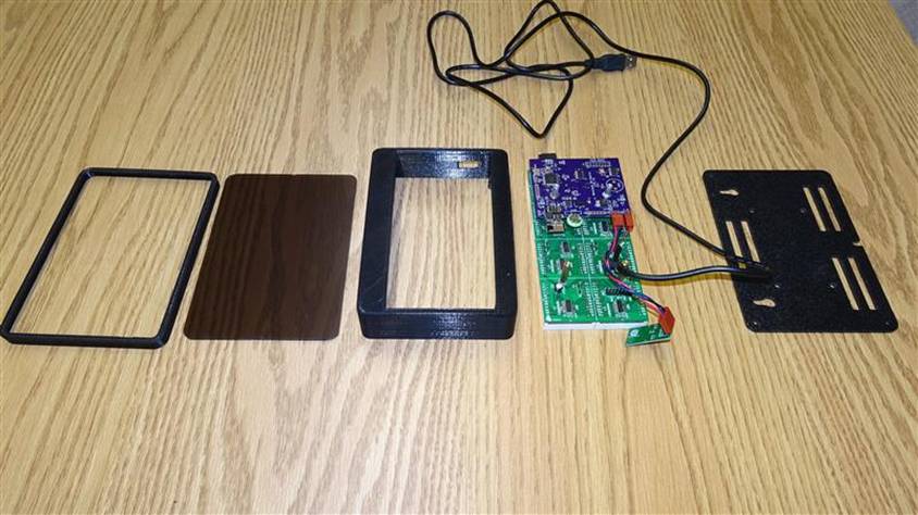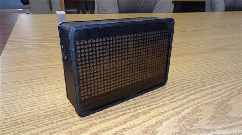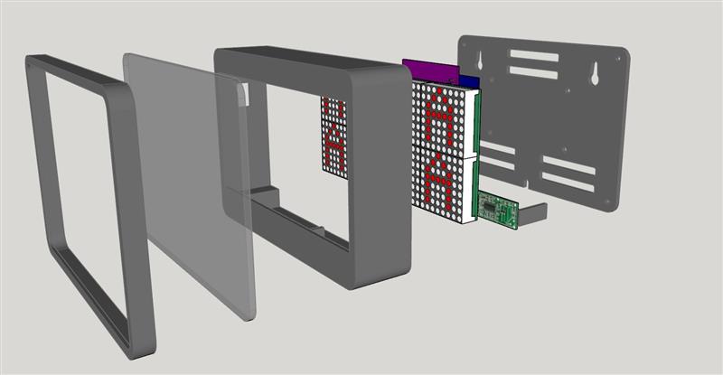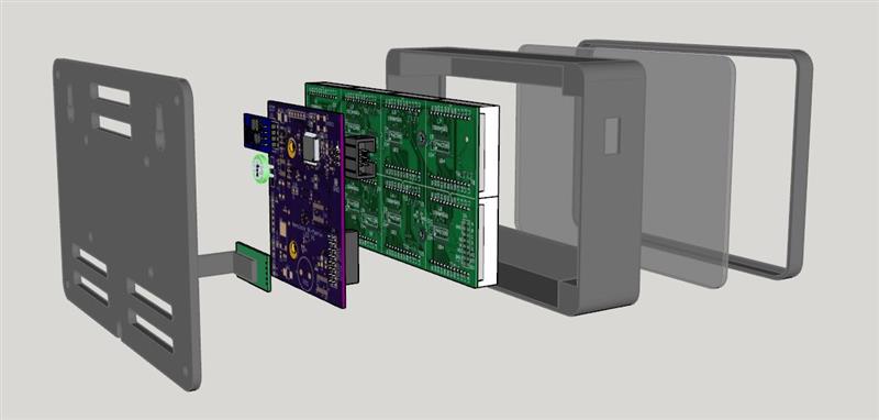 This was a great project in that it required work in a lot of areas. Naturally I had to design the electronics and write the software. When that was done, I laid out a PCB that would plug onto the back of the LED matrix bd. I designed and 3D printed the enclosure’s main body & front bezel surround. I milled the front gray plexiglass filter and ABS rear panel on the CNC. See the CAD drawings of the whole project exploded and the photos showing the final pieces.