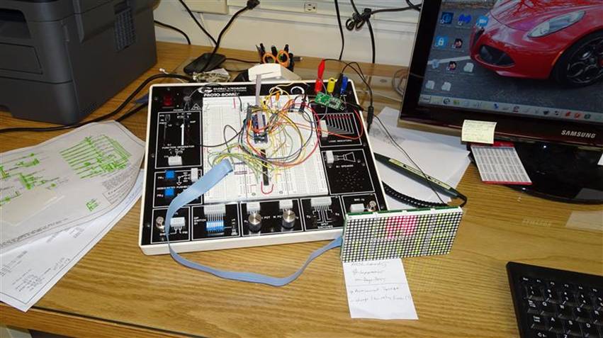 First I built up the matrix “kit”. Then I went about putting together a circuit on my prototyping station using my own 9S08QE128 breakout board. The first goal was to just light up all the LEDs. Well, no wonder this thing was so cheap. One of the matrix blocks was WAY brighter than the rest. I was used to LEDs being graded for brightness so they could be matched up, but this is China! Naturally, I had soldered them all in and I didn’t have anything to replace the overly bright block with anyway. I just put the whole thing back on the shelf where it sat for a few more months while I did other projects.