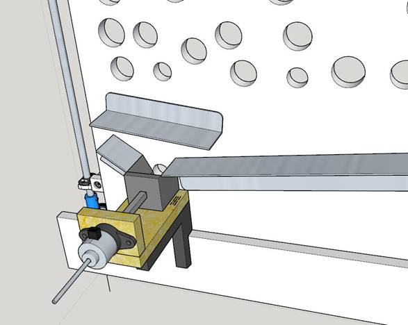 OK, so the ball goes through a hole, target or otherwise. I had to design an internal structure that channels the ball into my “Ball Setup Mechanism” (BSM). This was one of the hardest parts of the project, where I made various panels out of thin 1/4” plywood in combination with various aluminum angle pieces to direct the ball, no matter where it landed, into the opening of the BSM. I had to make a mechanism which would push the ball out a hole located near the bottom of the playfield board and drop onto the bar at the beginning of each round. I used an unusual “Non-Captive Linear Stepper Motor”. It has a small 3.5mm diameter lead screw which goes right through the motor. The inside of the motor has female threads which turn. If you drive the motor to make it turn, but don’t hold the lead screw, minor friction will just make the lead screw turn. But, prevent it from turning and the motor’s internal threads make the lead screw travel. I took a small 1/4” square slippery HDPE plastic rod, put a hole at one end and threaded the small lead screw into it. This square rod then goes through a square hole at the back of the BSM’s “cup”. Now when the motor turns, since the lead screw can’t turn, it thrusts outward and the other end of the square plastic rod pushes the ball out onto the bar. I have a µswitch positioned to detect when the pusher rod is at the home position, so all I have to do is give the stepper a specific number of pulses and I know it will deliver the ball. Then I just have it retract until it hits the µswitch. I have a short video where I’m bench testing it. |