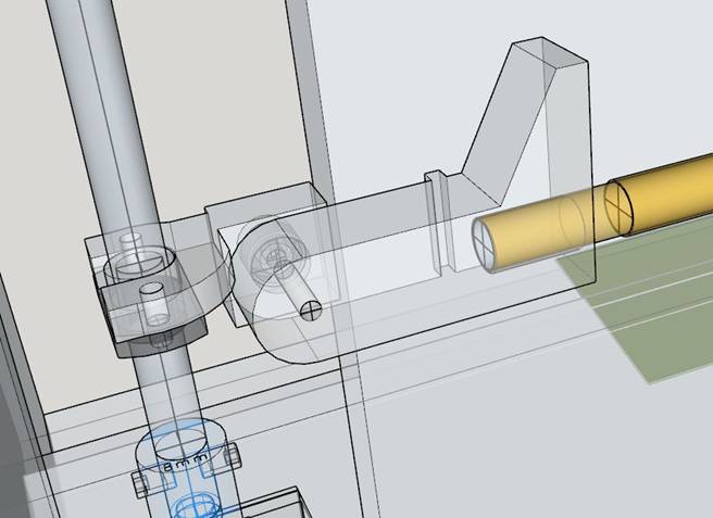 Here we see the 3D printed part with a U-shape that couples to the delrin lead screw nut below it which is dark and mostly hidden. To the right of the U-shape is a small box shape. This houses the tiny bearing. A small 3mm screw with nut goes through the bearing and is tightened. There are 2 or 3 tiny washers against the nut on one side and the back of the other 3DP element which captures the brass bar and creates the ball stop. The bearing lets this rotate up and down freely. See X-ray view below. |