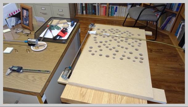 I finally found a file of the hole pattern, one that is supposedly very close to the original. This is more important than it sounds. If the pattern has the holes too closely spaced, no one will ever get the ball into the more difficult target holes. If the spaces are too large, the game would be too easy. I’m assuming lots of trial and error went into creating the hole pattern in the original game in order to strike the right balance. I used the pattern I found on line and by counting pixels from ICB photos decided it was indeed close enough to the original. My CNC can only cut within certain limits, so I rearranged some holes at the left and right edges to save an inch of width overall so it could be milled.