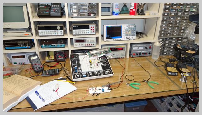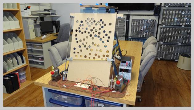 Here on the bench experimenting with ball detection as it goes through a ball channel. Also note the VFD display being exercised on the Proto-Station. |