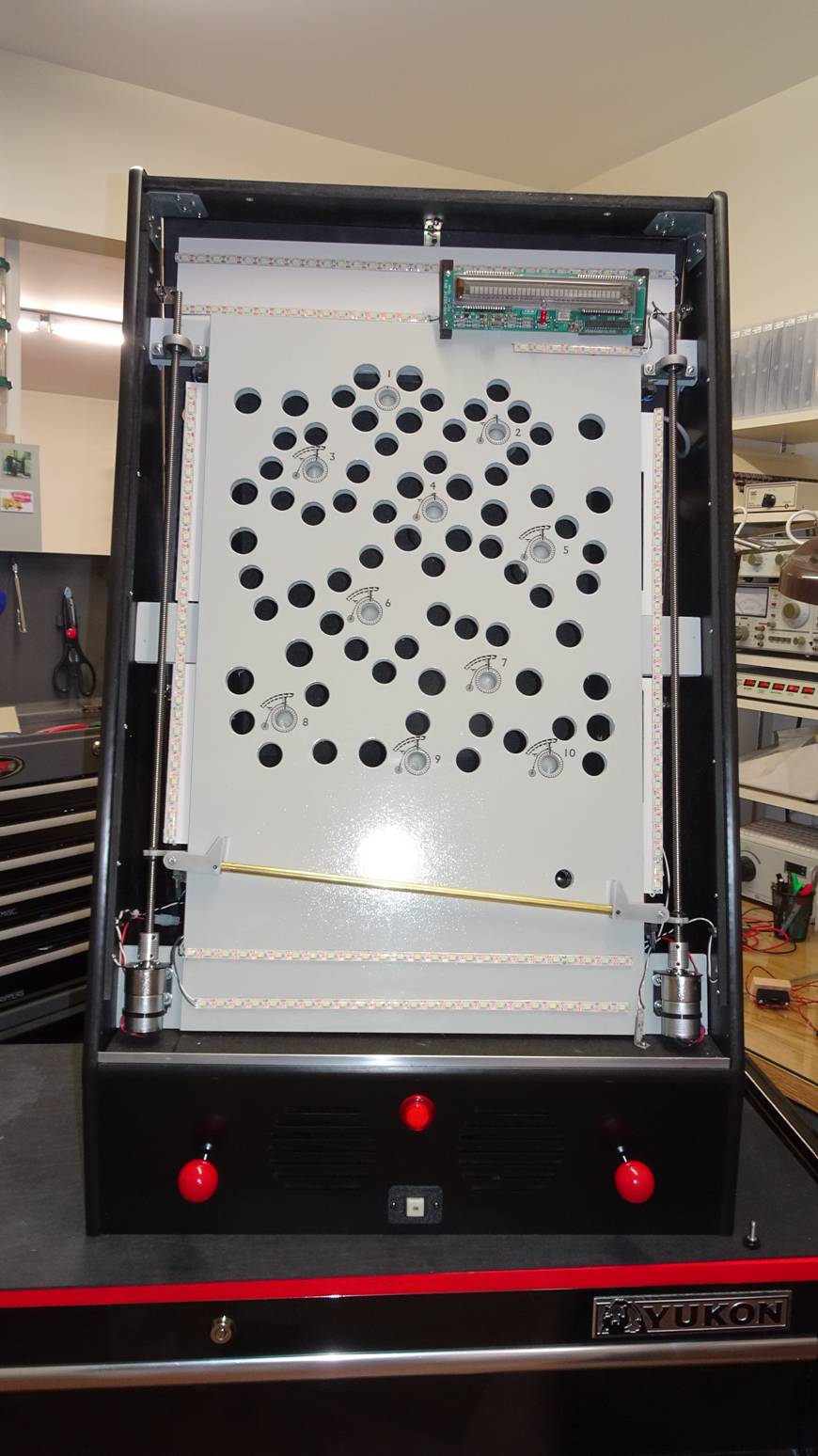 I had made a temporary setup where I propped up the playfield and used simple logic to control the motor drivers. This allowed me to experimentally decide on the playfield’s angle and the optimum motor speed. It turns out that if the motors go too fast, you can’t control the rod’s position precisely enough to balance the ball. Too slow and it becomes too easy in some situations but makes quick changes more difficult. Fortunately I hadn’t ordered the motor’s power supply yet, and armed with this experience I ordered a variable one which I keep at 10V. For the +5V supply, I started out with a small 3A open frame switcher. Toward the end of the project, when I started experimenting with LED strip lights in order to backlight the graphics, it became clear that I needed one-LED granularity. Therefore I ordered LED strips that were designed for +5V, where each LED has it’s own current limiting resistor. The more common 12V or higher strips are a series-parallel arrangement where you can only snip them in increments of 3 or more. So I swapped in a +5V 10A supply.