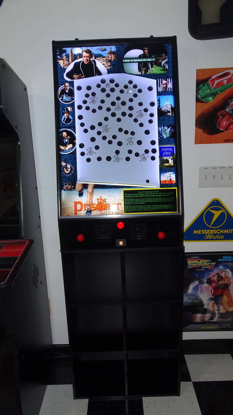 Prisoner Game, finished and placed in our “Diner”. We found this shelf / cube unit at Walmart that seemed like it was made to be the pedestal. Backlit graphics still bright in normally lit room. |