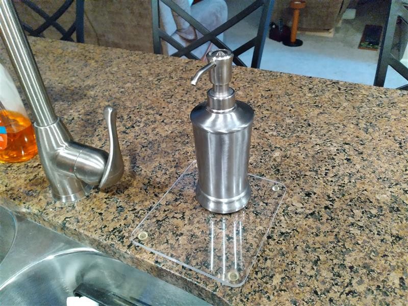 [2021-04-28] Linda wanted a counter protector tray for the kitchen soap dispenser. I thought about several approaches, but in the end the simplest was really the nicest. I took a scrap piece of .22” plexiglass and CNC’d it to size with nice large radius corners. I had just enough clear rubber feet in stock to finish it off.