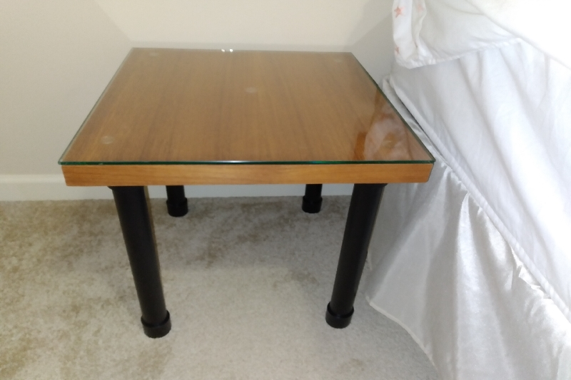 Long ago we had made two rather large teak end tables. We took one of those, cut it in half and made it into two nightstands. We took the glass top and had it cut in half to make tops for the nightstands.