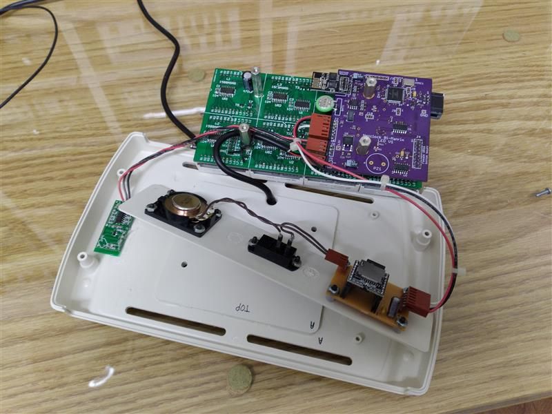Then I assembled another of my dedicated matrix clock controller boards I had designed, which has the µC, RTC, WiFi, etc. Then I put the whole clock together on the bench and verified operation. Next came designing a little PCB to hold an mp3 player module. I CNC’s it and then assembled it. I continued modifying the software to incorporate sending serial commands to the mp3 player module. I recorded and edited some sounds from Alien Sidestep and loaded them on a µSD card which gets inserted into the mp3 player module. I decided to have the sounds occur at the top of the hour and at :15, :30 & :45 minutes, somewhat like a grandfather clock. At least the sound effects would have a small practical value.