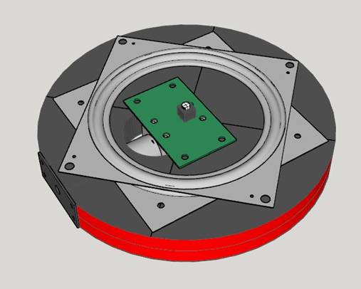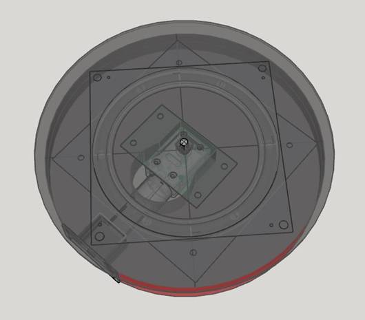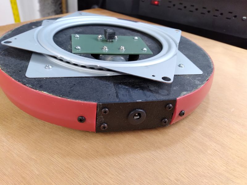 At first I went with a used AC gear motor, but it quickly failed. I ordered a 3RPM DC gear motor and made some small jigsaw cuts in the CNC’d wood base to make it fit. I milled a disc from 1/4” plywood for the top rotating surface and used a simple lazy susan mechanism in between. I 3D printed an adapter which has a D-shaped hole to push on the motor shaft and an outside .4” square which the top rotating disc’s center square hole fits over. This transfers the force for motion and provides some play. I used an LED array from an old HF flashlight to put above the turntable in it’s “cube” to light it up, as seen in the video.