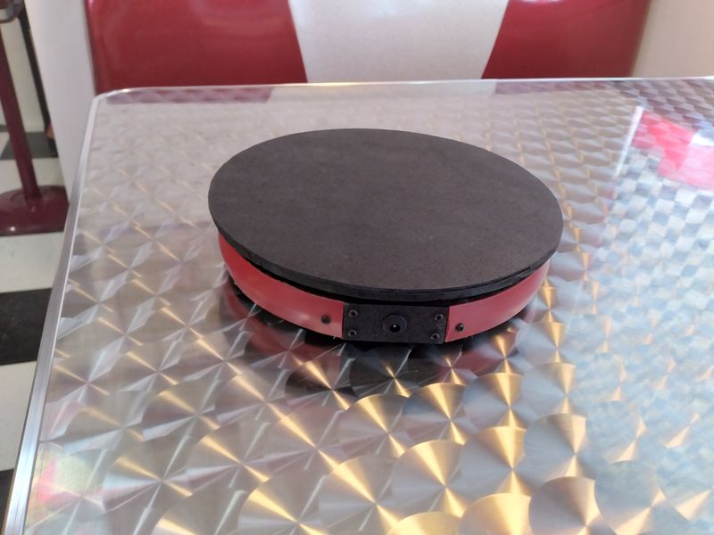 [2021-05-03] This idea has been sitting around for a long time. I never really had a place to put this, so I never got around to building one. Now, though, the “pedestal cubes” under the Prisoner Game in the Diner have 6 openings. In one we have this light-up sphere which looks just like Rover. I thought the next cube over would be a great place for a Model Car Turntable.