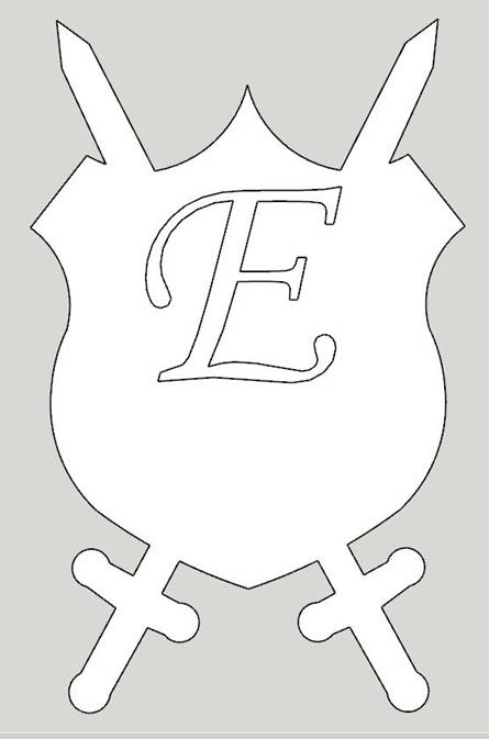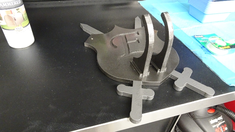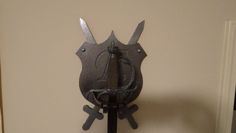 I designed a kind of plaque/coat of arms and CNC’s it out of MDF. Linda painted it to look like hammered metal. I CNC’d two brackets which pretty much match the shape of the handle surround to hold the sword.