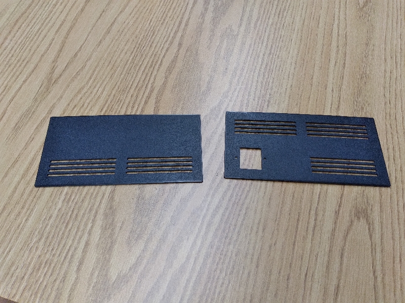 Anyway, I decided to set it up and use it for whatever it could handle. The first time I used it the power supply burned up! I wasn’t going to spend money on a new supply, so I decided to use whatever I had sitting around that was 24V. That turned out to be a huge open-frame linear supply. The only appropriate enclosure I had that was big enough was an old faded brown color. Linda painted it black, and fortunately the front and rear panels I had for it were already black. I CNC’d the panels with slots for airflow and an HP power inlet on the back.