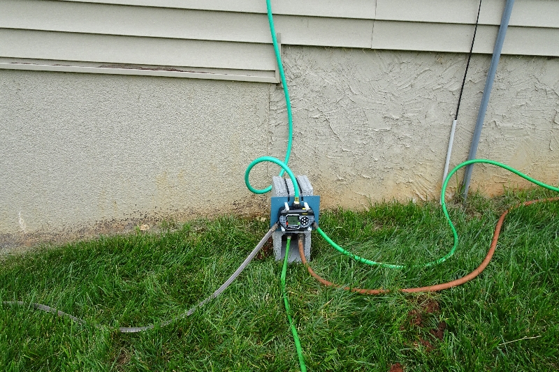 We ended up getting two 4-way timers to feed 8 sprinklers. They started out just hanging from our two outside faucets, one on each side of the house. When the lawn people move the sprinklers and hoses out of the way, it puts all sorts of stress on that connection, to the point where one of our timers had it’s inlet connector break off. For this and other reasons, I decided to connect hoses going from the house faucets to the timer’s inlets, and mount the timers to cinder blocks to keep them up off the ground.