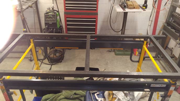 The only answer would have to come in the form of a steel structure. I rendered a support made from 1 1/2" box tubing, using 1/16" wall thickness to try and keep the weight down. Four small vertical members would mate with the cart/bench's leg tops. My drawing was great, but I don't weld! My friend John is a metal man. He has all the metal skills and tools that I don't. In the end, he fabricated this big steel structure for me. Fortunately, he had the same cart/bench in his shop, so I went over and we assembled it right on his cart/bench.
