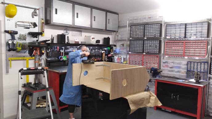 I put that steel structure on the cart/bench and fastened the new benchtop to it. Then I printed out various views with dimensions of my new enclosure design and began cutting aluminum T-Slot extrusion and plexiglass. I also used the Shark, with no enclosure yet, to CNC the riser plywood. I designed shelving which would hang on the end of the cart/bench with slots to interweave with it’s structure. This is where all the electronics would sit. These pieces were also CNC'd and put together. When I finally got it all together and it worked, I took it apart and Linda painted all the wood elements & steel structure black. I put it all back together and started on the final element, the end doors.