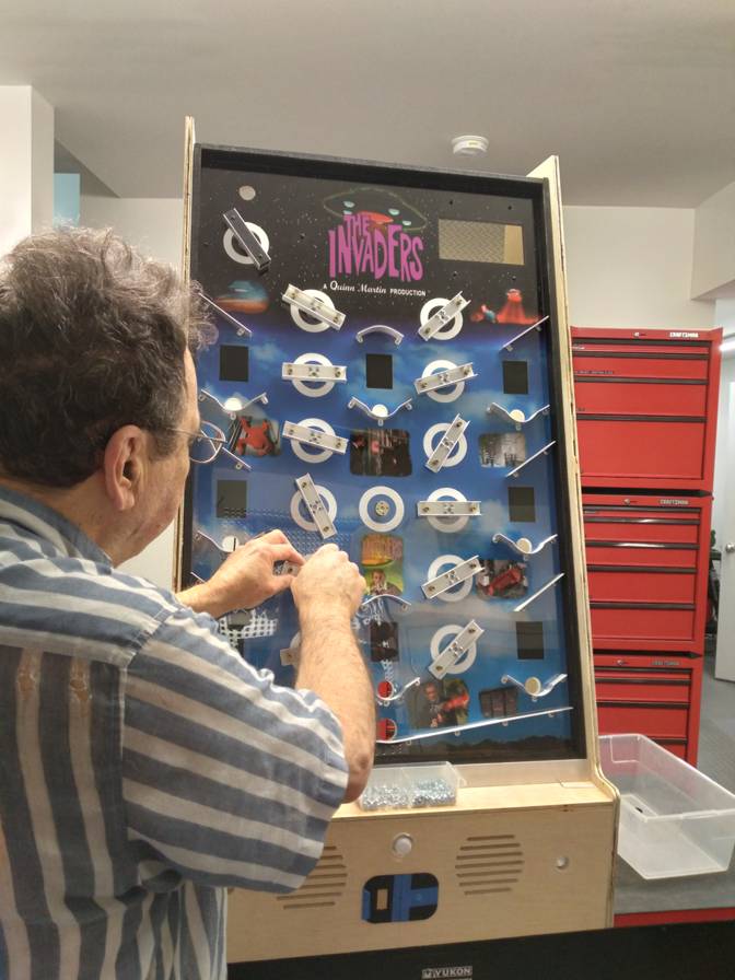 New Boards: Invaders Game Controller Bd LCD 320x240 Controller (one for each of the 8 LCDs) WS2812B LED Controller (to control 14 Ring Lights & UFO Bottom Red Orange LEDs, 15 total) Motor Control Gating (small board attached to each Ring Light controller to gate joystick motor control) Sensor Concentrator (CNC) (selects & passes on status logic from current target hole ball detection) UFO Interface (gathers all signals for UFO, third mp3 module, etc.) UFO Bottom Red Orange LEDs (controls UFO's bottom "thruster" LEDs red/orange/white modulation) UFO Top LEDs (sequences the white porthole LEDs at the top of the UFO) Microswitches to Contoller Int (CNC) Pushbutton Bd (CNC) (manual linear actuator buttons on top of the machine to facilitate service)