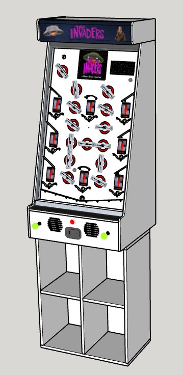 Since arcade games have a marquee box at the top, this gave me the perfect place to keep the surprise. I created graphics for a backlit marquee. However, the real reason for the top box was to hide a model UFO. So, when you "Win!", all the Ring Lights go out, the marquee backlight goes out, all the LCDs show a picture of the UFO taking off at night, and the Scoreboard flashes "Lift Off!" in red.