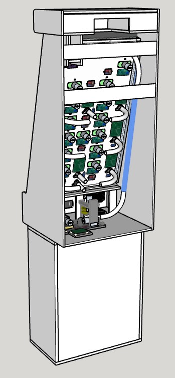 This mechanism has it's own dedicated µC, 3 motors and 6 µswitches to choreograph receiving the returned balls, isolating them to drop one at a time into a "pusher tube", then be pushed by the "pusher" (kind of like a rifle's "bolt") into a "chamber". It waits there as another gating plate opens up and then the pusher forces the new ball into a long, mostly vertical tube filled with balls. When one ball is pushed into the tube at the bottom, one ball is pushed out at the top and onto the playfield.