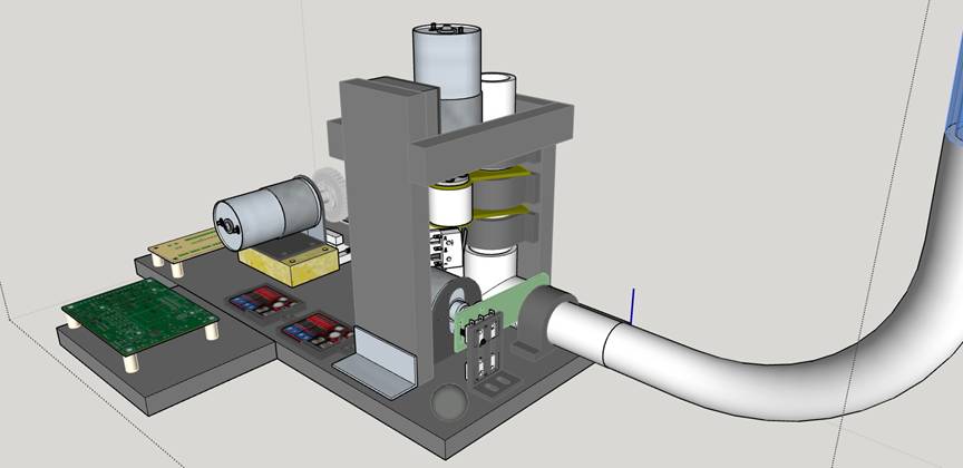 Ball Transport Mechanism An early decision was to use 3/4" plastic balls instead of the usual pinball chrome metal balls. Being a vertical machine and having a game layout where a long freefall was likely, it was a necessity. The most difficult part to design and build in this game was a mechanism to take the balls from the bottom and deliver them one at a time to the top to be dropped onto the playfield. I went through several concepts, finally designing a mechanism which looks a little like part of a bolt action rifle.
